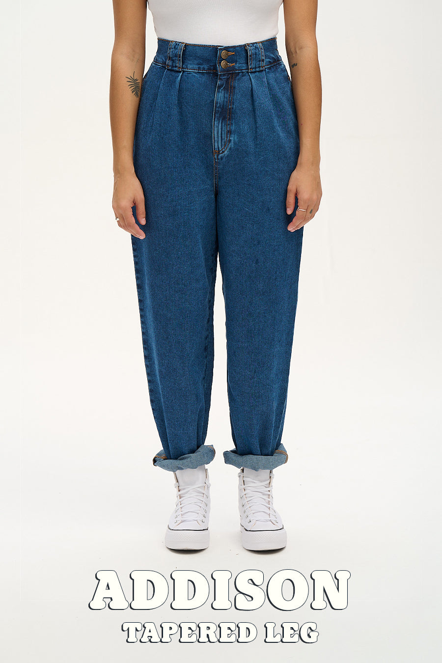 Addison are our high waisted jeans, sporting an elasticated back and full length leg. Referred to as “magic trousers” by those with big hips and without. Discover our full range of Lucy & Yak Bottoms here.