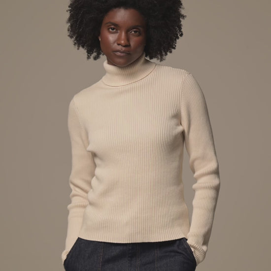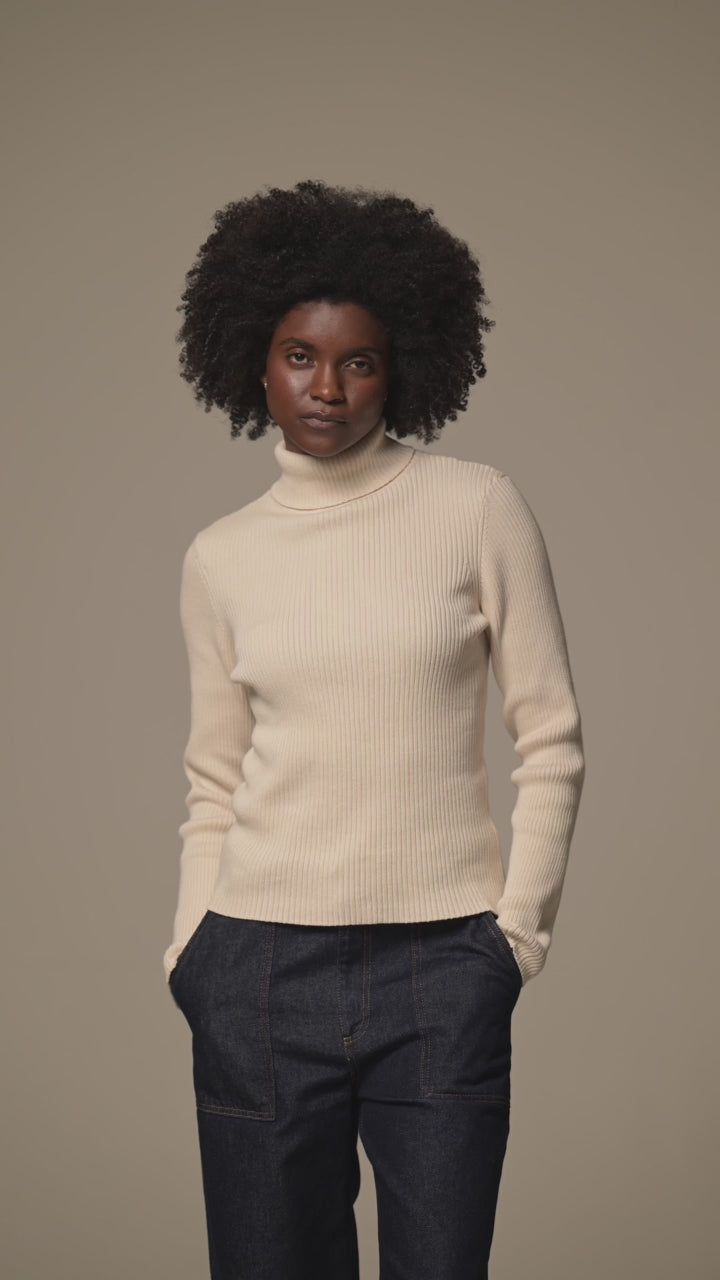 Eva - Cotton Funnel Neck Long Sleeve Top in Pearl